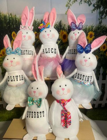 Peter Rabbit and his cousins; Fuzzy Tail and Fluffy Ears are on their way to the Easter Egg hunt and fashion show. They stand 25" tall and are filled with details from the Top of their hat to the bottom of their feet. They look fantastic with holiday decorations. There are a couple more fabric options if you'd like a different color combination. Contact me if you're interested in adding one of these cuties to your home, or a unique gift to give.